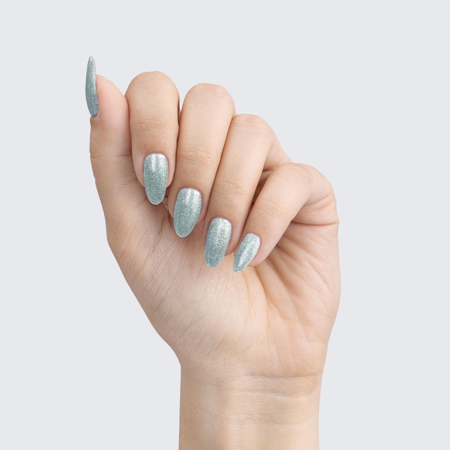 Silver with pale blue tint. Metallic foil sparkle. Opaque. Cool undertone.